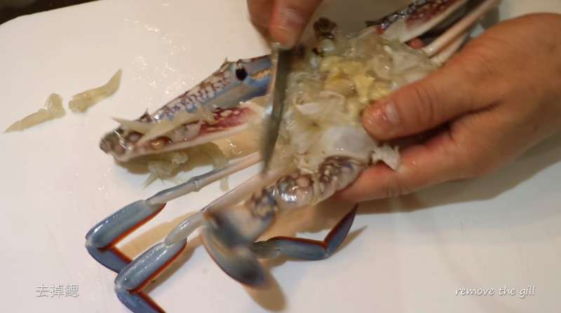 ▼用小刀將螃蟹的鰓去掉。