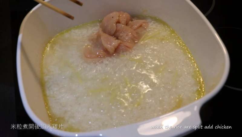 ▼米粒都化開後,就可以加入雞肉片,將雞肉煮至全熟。