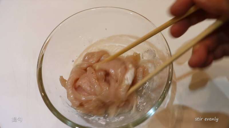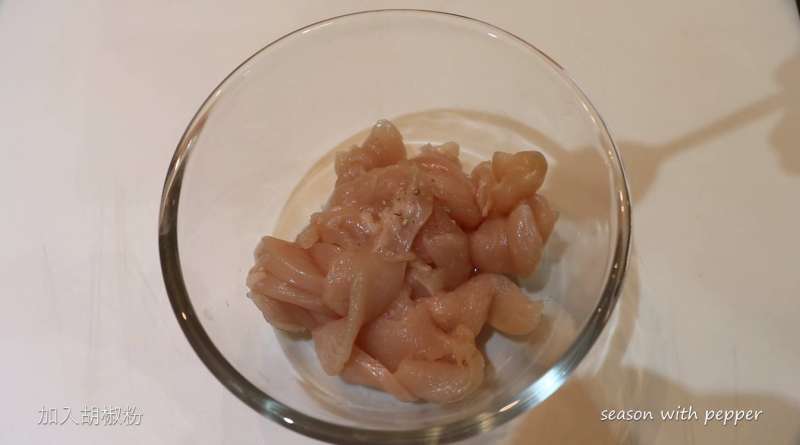 ▼將雞肉切片後,在雞肉中加入適當的胡椒粉、鹽、玉米粉和油。