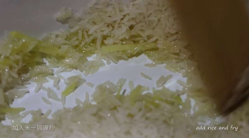 ▼接下來將白米倒入一起炒。因為乾米直接炒味道會比較香,如果擔心的話也可以先將米洗一洗瀝乾才倒入。