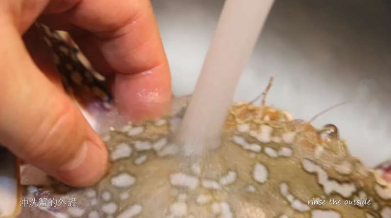 ▼接下來開始處理螃蟹的部分!首先用水將螃蟹外殼洗乾淨。這樣要注意的是如果不喜歡吃螃蟹,也可以使用蝦子、蚵仔、魚等海鮮取代之。