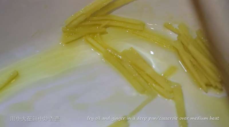 ▼可以開始下鍋了!首先在鍋中放少許油,接著倒入薑用中火炒香。
