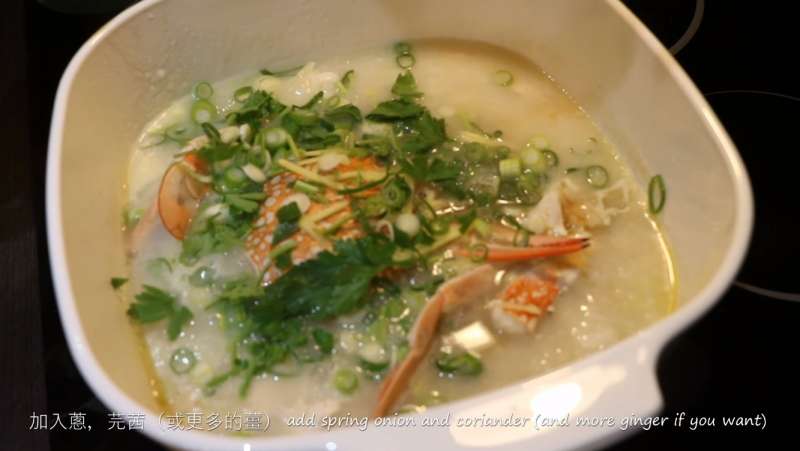▼接著將蔥、香菜和薑倒入粥內。
