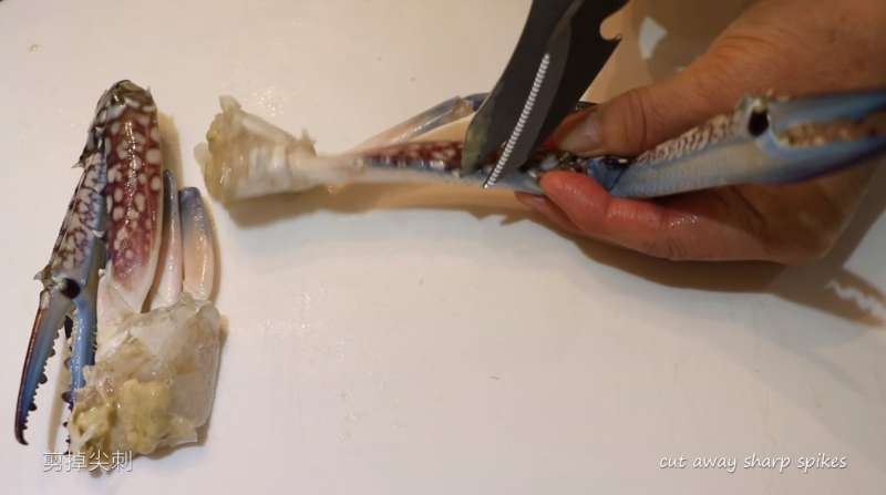 ▼將處理好的螃蟹切成幾段,接著將殼上有尖刺的地方剪掉,以免食用時刮傷。