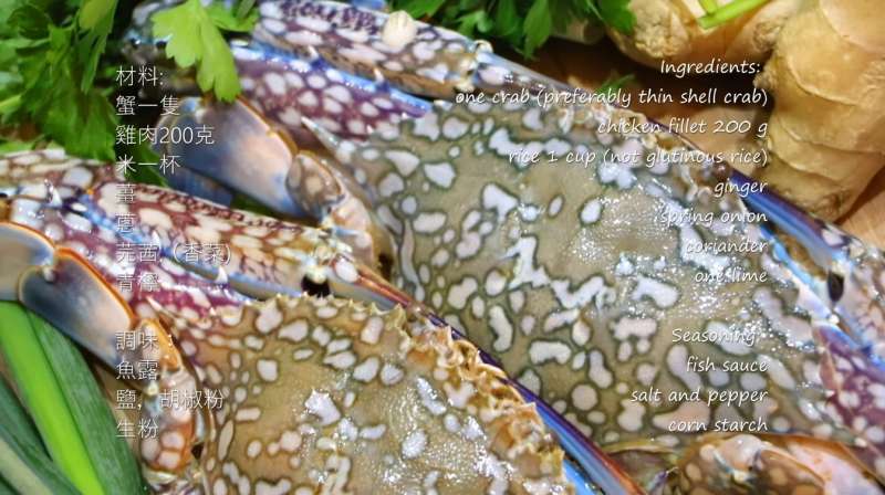 ▼首先要準備的材料有:殼比較薄的蟹種一隻、雞肉200克、白米一杯、薑、蔥、香菜和青檸;調味料的部分則有:魚露、鹽、胡椒粉、玉米粉適量。
