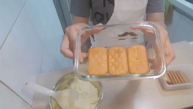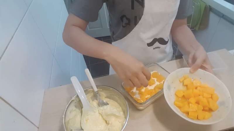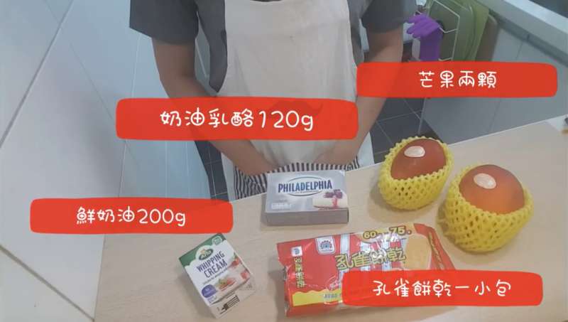 步驟4. 底層先鋪一層孔雀餅乾,然後一層乳酪餡,一層芒果,喜歡吃芒果就可以多加一點~然後再重複一遍,兩層的概念就是了!