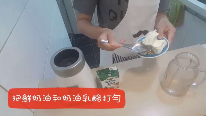 步驟2. 然後把鮮奶油和奶油乳酪打均勻,打之前可以搖晃一下