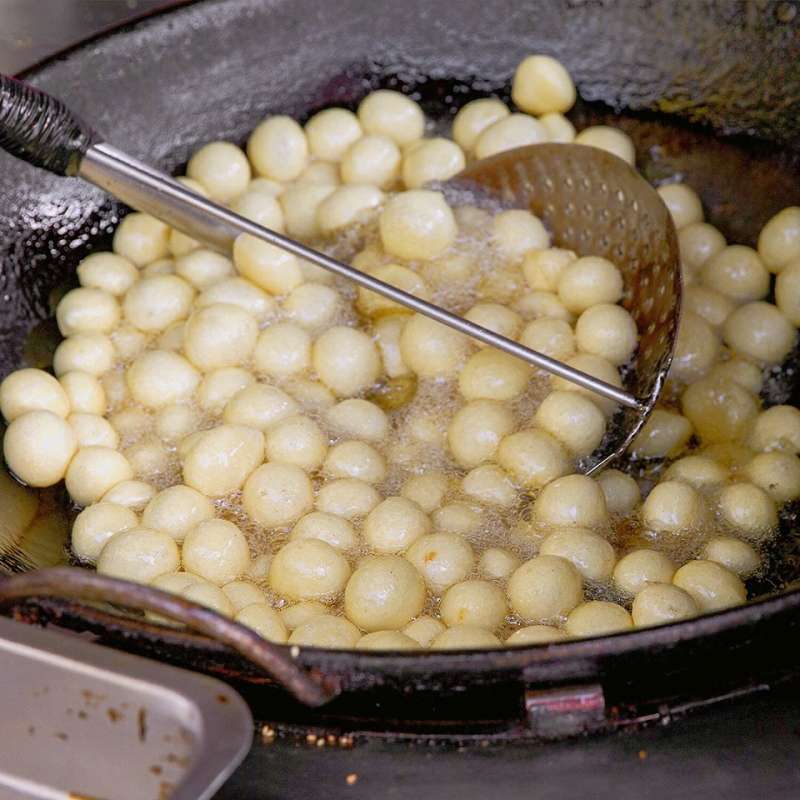 ▼看到這滿鍋的地瓜球,是不是讓你垂涎欲滴了呢?不僅地瓜球只要一元的佛心價,就連內餡有花生,外層灑滿了芝麻的芝麻球,一顆也只賣5元,薯條一份也只要15元!