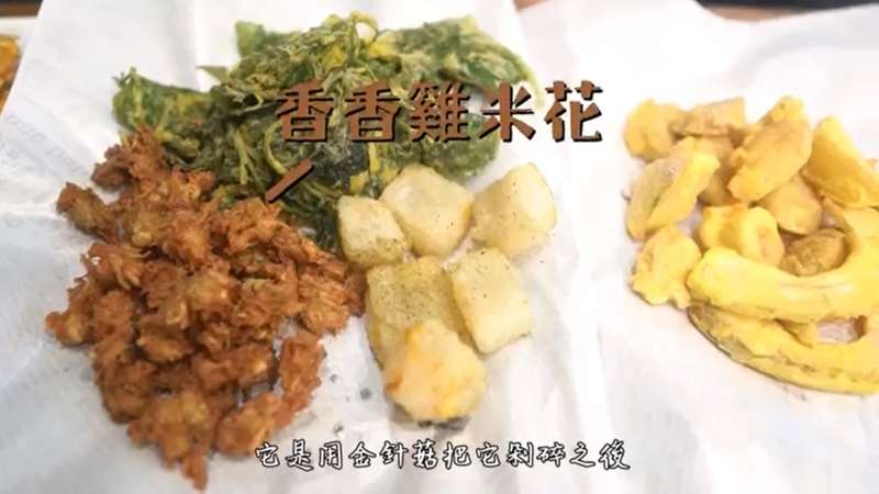 ▼香香雞米花是用金針菇剁碎後捏成一塊一塊