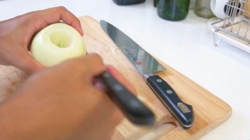 ▼將洋蔥頂部切掉1/3或1/4都可以,去皮後,底部不要切掉太多,一點點就可以了,將中心挖出一個三角錐的形狀。