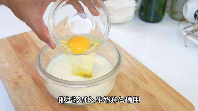 首先將所有的粉全部拌均勻後備用,再把打好的蛋倒入牛奶攪拌均勻也先放著備用。