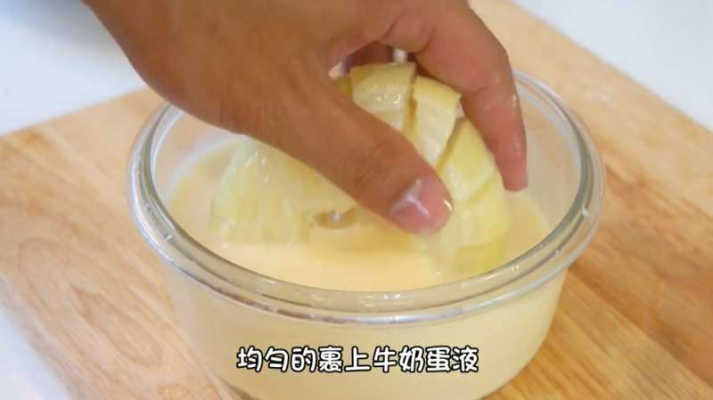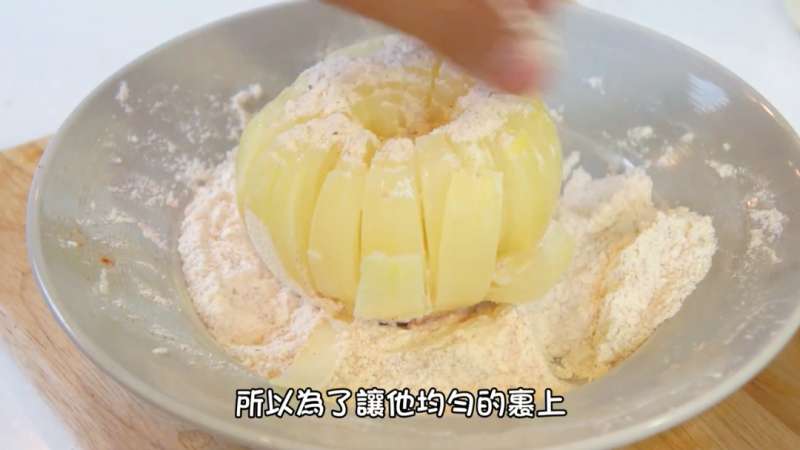 把洋蔥放入剛剛準備好的蛋液牛奶中,均勻的沾裹,再放入麵粉中,每一片洋蔥花瓣都要均勻上粉,這個步驟要重複兩次,到時候才會漂亮!