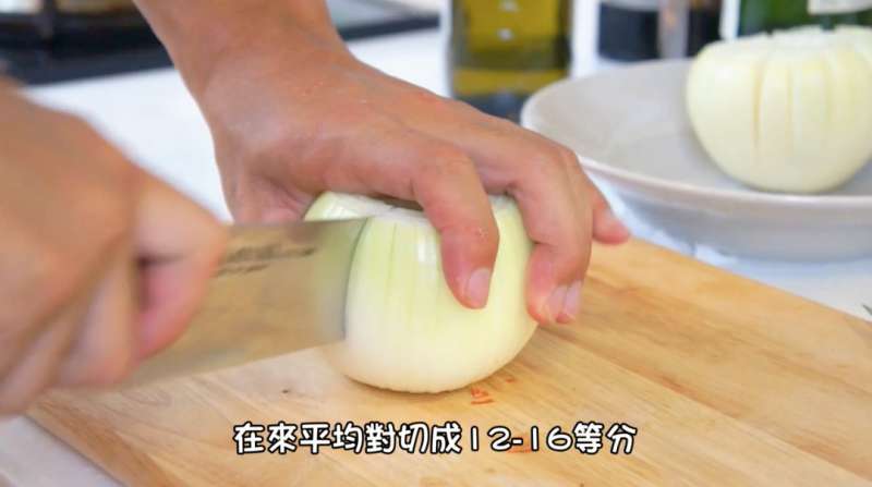 然後平均對切成12至16等分,大約留1/3左右,不可以切斷!不然就變成炸洋蔥花瓣了!