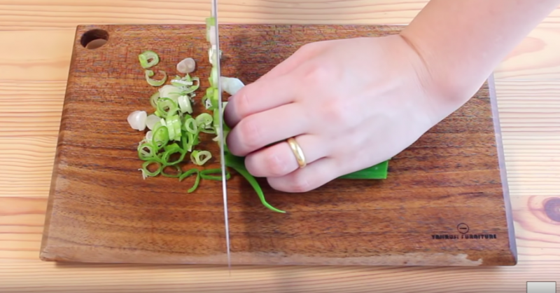 ▼切好蔥、魚糕備用;