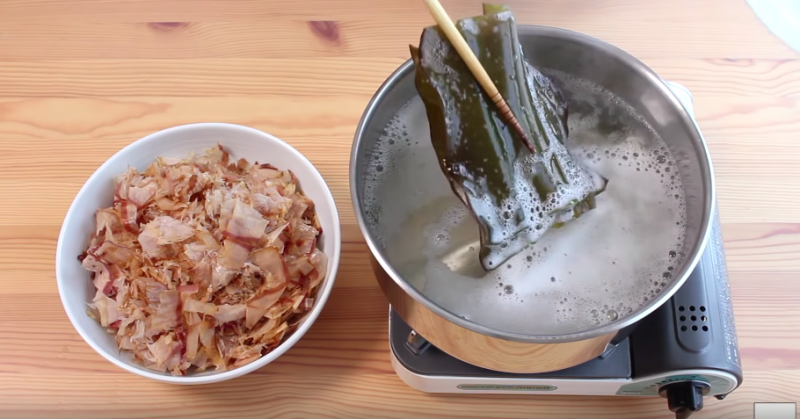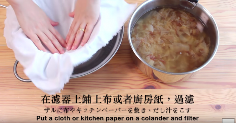 ▼點火煮昆布,沸騰後關火,撈出昆布,再次點火,水沸騰後關火,將柴魚片放進去,去除表面的雜質,等3到4分鐘,沈澱一下;