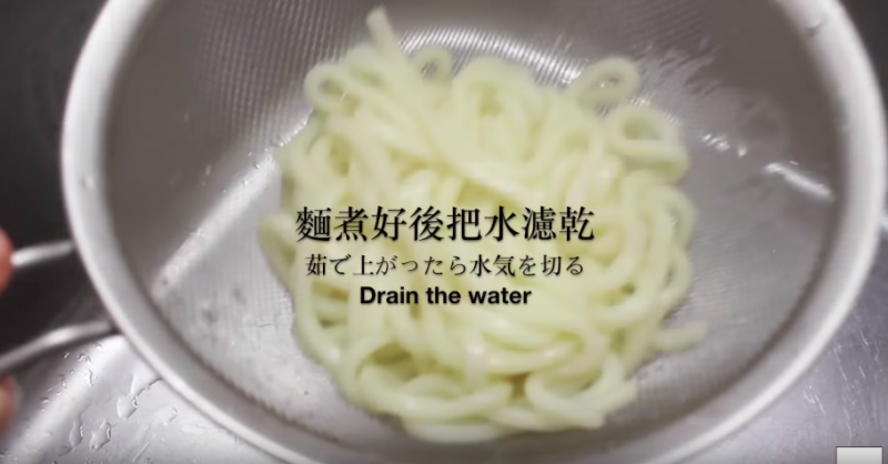 ▼煮好烏冬麵後把水濾乾;
