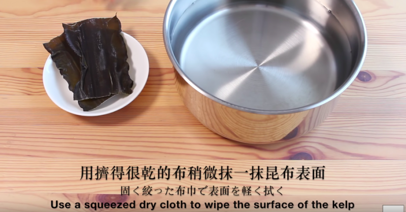 ▼用乾布稍微擦拭昆布表面,表面白色的粉是鮮味,不需要全部抹掉,放入水中浸泡30分鐘到1小時;
