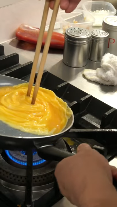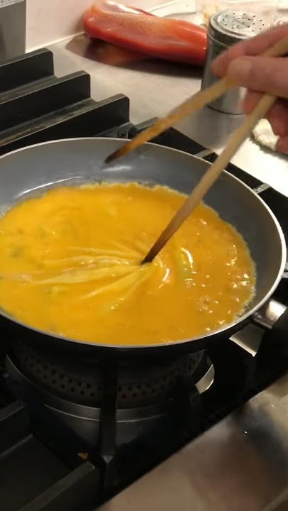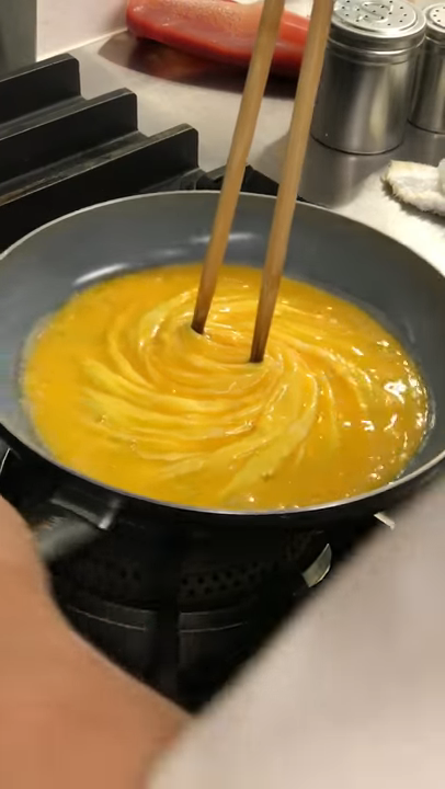 ▼從鍋邊用筷子分別把蛋液畫向中心,讓它些微的變皺。