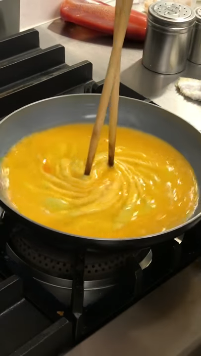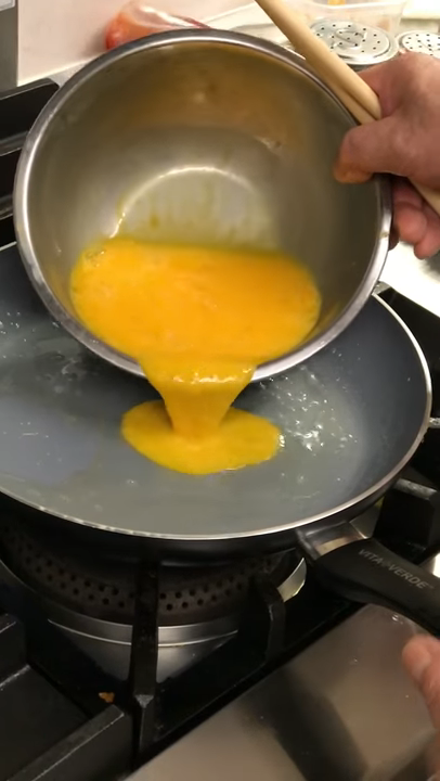 ▼日本師傅的渦卷蛋包飯和一般的蛋包飯做法有點差異,先在鍋裡加入新鮮的蛋液。