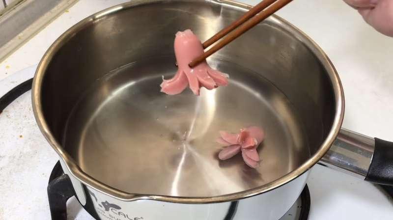 ▼再將小香腸尾端切開,放進水中汆燙,馬上就會變成小章魚的造型!
