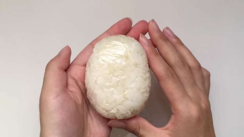 ▼首先準備適量的白飯,放進保鮮膜中將其揉成橢圓形。