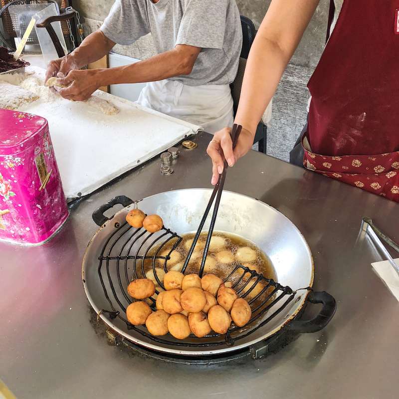 ▼老闆專注著手工現做,將麵粉與雞蛋混和成麵糰,放入每天熬煮的萬丹紅豆泥不甜也不膩,放入每半小時換一次油的油鍋中,炸成一顆顆金黃美味可口的小饅頭,外酥內軟內餡綿密,早期的麵團是由麵粉與雞蛋混和成的,後來為了讓大家吃的到「蛋香味」才改用鴨蛋,真的是百吃不膩的老味道!