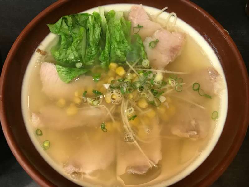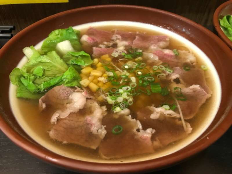 ▼黃金川燙時間約在五秒左右,6、7分的熟度的牛肉片,肉質最為軟嫩鮮甜,入口即化,另外店家也有附上特調醬料可以沾著吃,別有一番風味!牛肉麵搭配的手工拉麵屬於細麵,裡面還有玉米與薑絲,湯頭非常鮮甜!