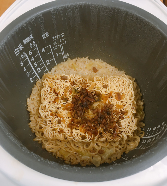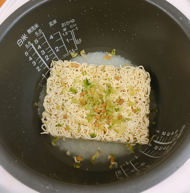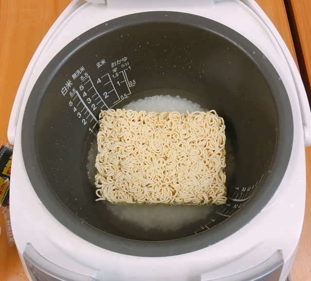 ▼米飯與泡麵分開煮熟之後,加在一起的味道是可行的,但是麵跟飯一起加入電鍋烹煮,可就沒有人嘗試過了,佐藤先生突發奇想準備了日本知名「Peyang Instant Yakisoba」炒麵與洗好的生米一起放入電鍋裡。