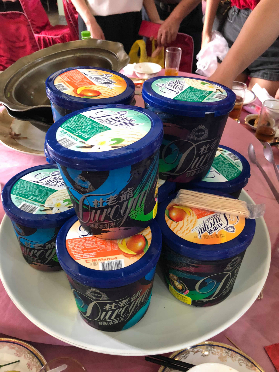 ▼不只棉花糖吸睛,辦桌澎湃的甜點居然是準備杜老爺冰淇淋「1公升桶裝版」,8、9桶直接搬上桌,堆疊成一座小山,連原PO都笑著說:「太熱用喝的!整桶吃完都流鼻涕!」