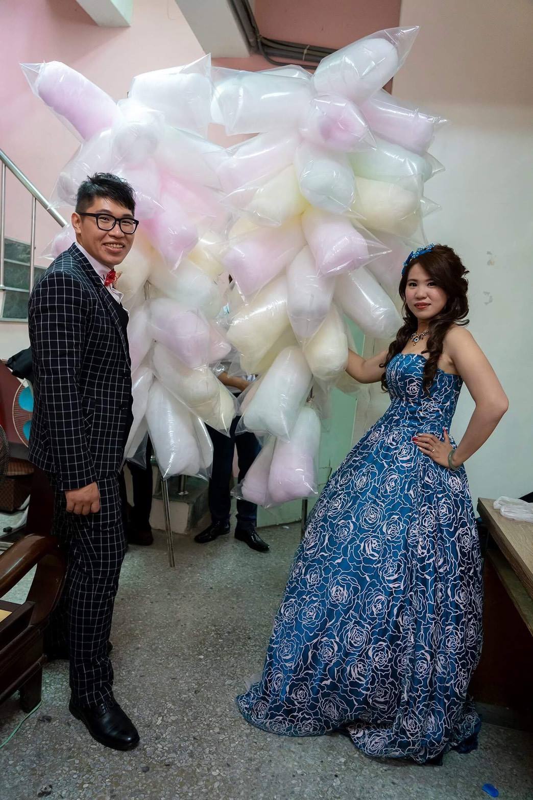 ▼新人二進會場時新郎手上多了跟掛得像椰子樹一樣的婚禮小物,新娘勾著新郎,手裡竟然拿著一根黏「巨無霸棉花糖串」釣魚式發禮物,讓在場來賓興奮伸手一把抓,同時現場演唱著道地的台語歌,相當有氣氛,連姊姊都不禁大嘆「配台語歌根本絕!」網友們紛紛大讚「好霸氣」、「好酷喔」、「滿好玩的樣子」、「很有歡樂的氣氛」、「南部辦桌就是霸氣」、「這好狂」、「好親切又歡樂!」