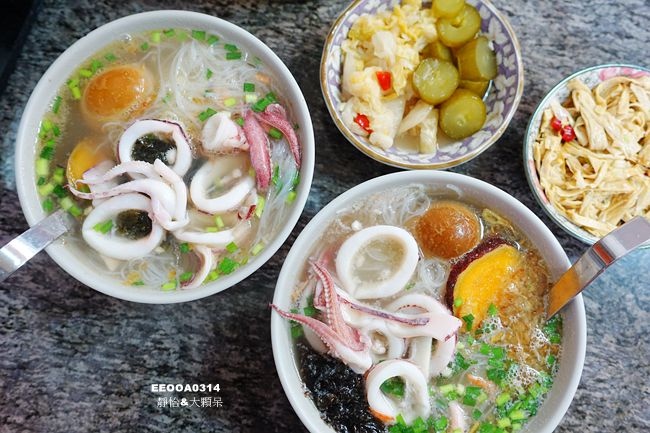 ▼點後沒多久小卷雞湯米粉就端上桌了,兩碗都是滿滿的料,除了主要的小卷外還有一大塊的地瓜及整顆滷蛋,光看就好滿足!