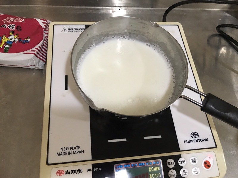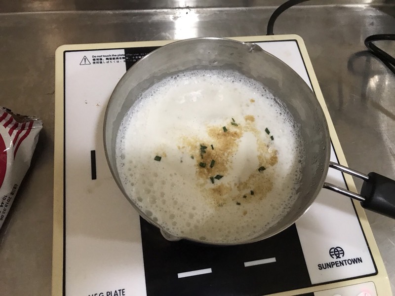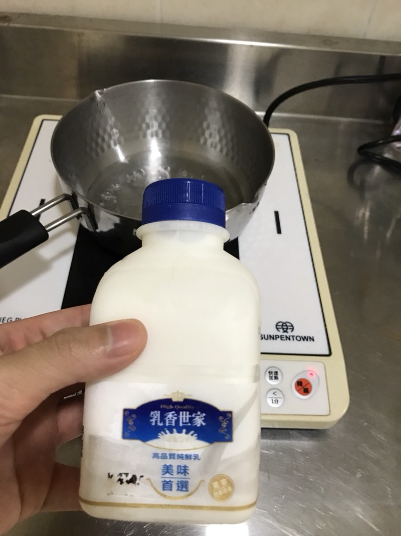 ▼先在鍋子裡加少量的水燒開(因為直接倒牛奶會粘鍋,所以用一點點水稀釋一下)。