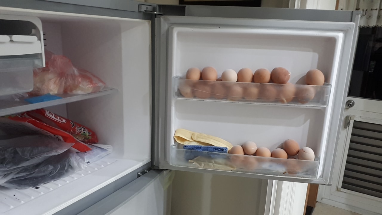▼從男網友的照片可以看到,冷凍庫裡有約23顆黃雞蛋,有的外殼甚至已經裂掉了。