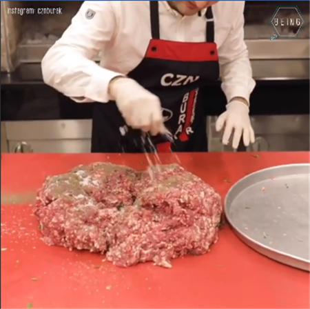 ▼影片一開始,布拉克先展示了自己的神刀工,快速切食材,接著開始製作最重要的牛肉餅,將事先剁碎的超大份牛肉撒上調料,打上兩顆雞蛋,再用手攪揉捏均勻,然後將調好的牛肉餡摔在烤盤上,鋪平後放進烤爐裡烤製。