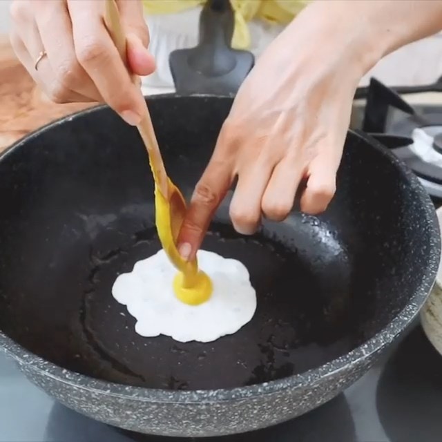 ▼在煎鍋中倒入橄欖油預熱。接著先倒入「2湯匙蛋白米漿」,以中至大火煎30秒;之後在蛋白中間加入「適量蛋黃泥」,再煎2分鐘即可上桌。
