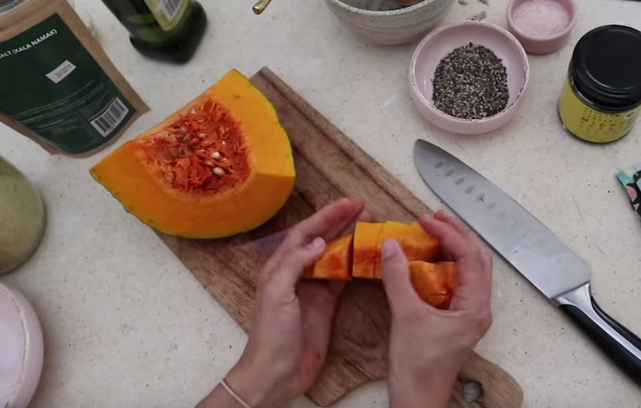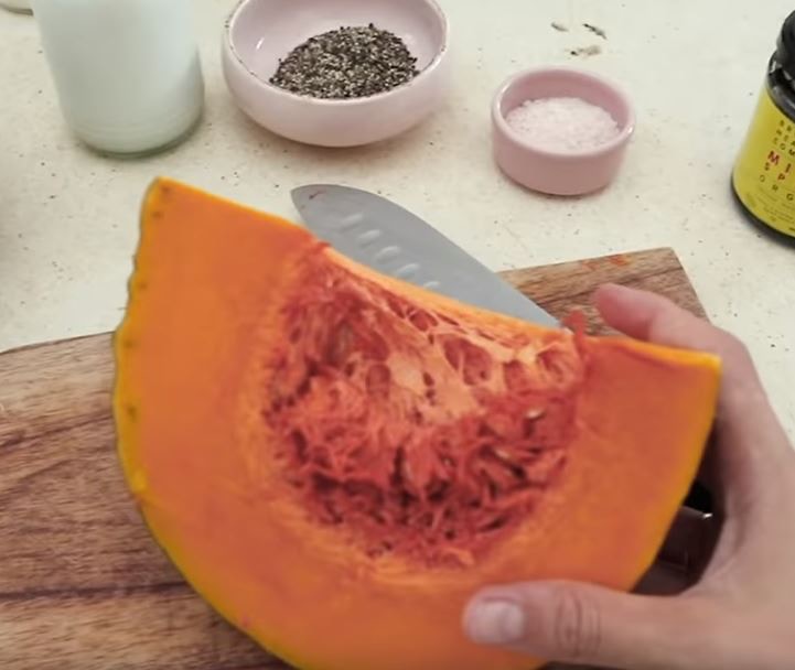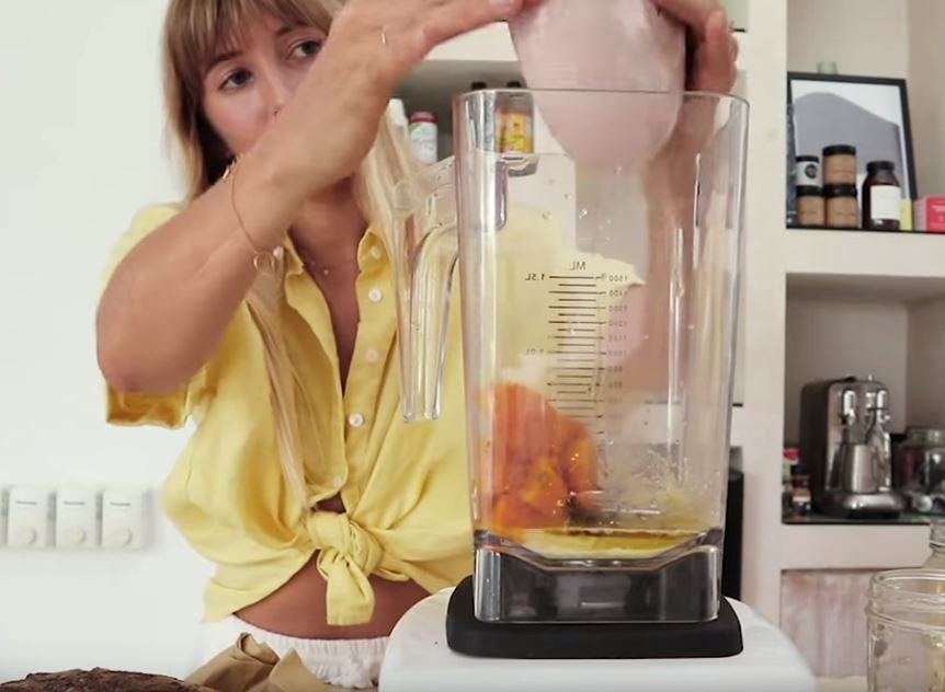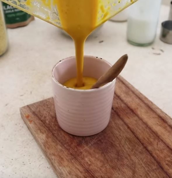 ▼再來就是我們的蛋黃部分啦!所需的材料有:「170g的南瓜(煮熟去皮)」、「1湯匙酵母」、「2湯匙栗粉」、「2湯匙清水」、「2湯匙橄欖油」、「1/4茶匙黑楜椒」、「1/4茶匙的喜馬拉雅火山黑鹽(或海鹽)」。之後把所有材料,使用攪拌機打成泥狀備用。