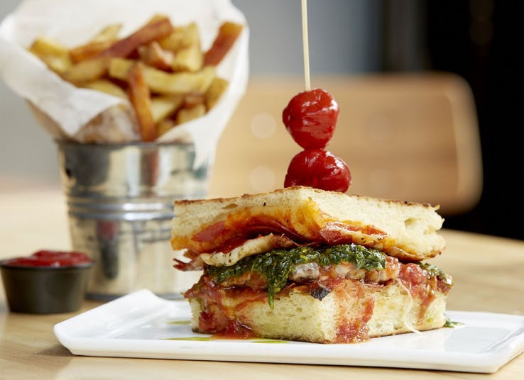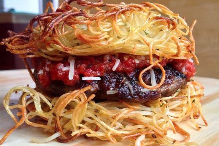 ▼意麵漢堡:外層的麵包換成了意麵,餡料則是莫札瑞拉起司肉丸、番茄醬和帕馬森乾酪。