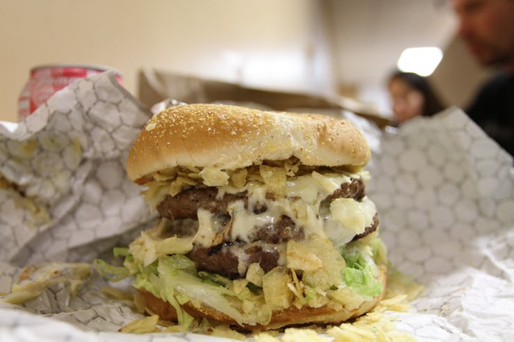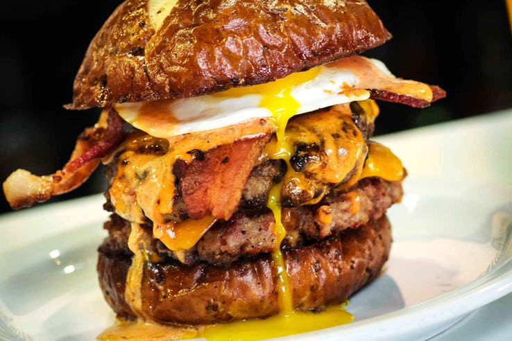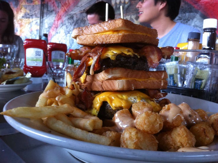 ▼三重心臟繞道手術漢堡:聽名字就知道熱量有多高!這種漢堡內有3塊肉餅、3個煎蛋、奶酪和培根。這些餡料被夾在2個烤奶酪三明治之間。