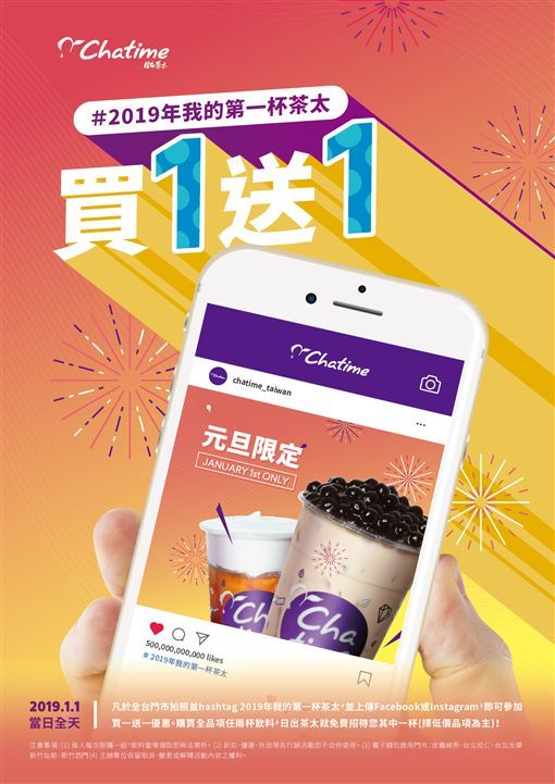 日出茶太元旦祭出限時買一送一優惠活動,凡於2019年1月1日當天前往日出茶太消費,拍照上傳臉書或IG,即可享有任品項買一送一的優惠。