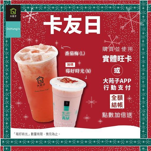 大苑子週二是卡友日,正逢遇上元旦,卡有購買番茄梅(L)、莓好時光(M),以「實體旺卡或大苑子APP行動支付」全額結帳即享10%點數回饋,再享點數加倍送。