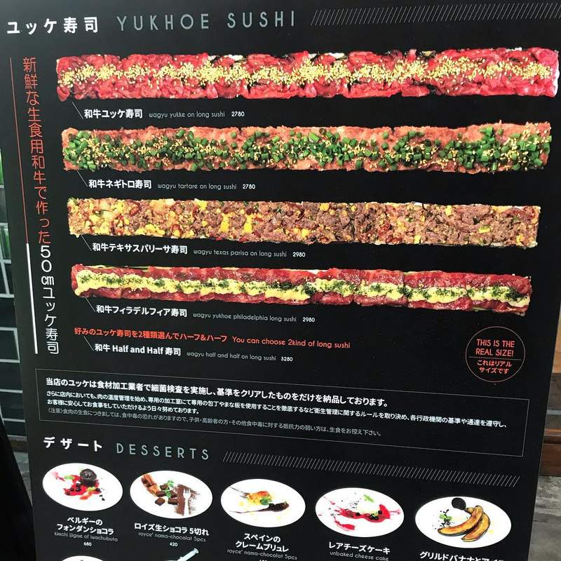 ▼從門口所擺放的招牌就可以看到,這長50cm 的全都是和牛壽司,價格也非常平易近人,也未免太夢幻了吧!