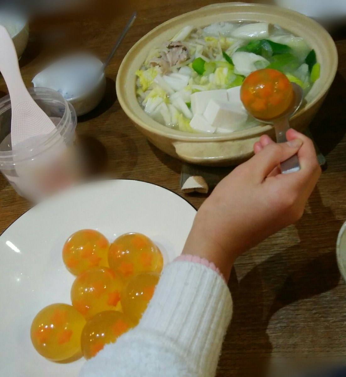 ▼@yuzuheath 表示在朋友家吃火鍋,看到朋友竟將火鍋裡調味的高湯粉做成了龍珠球,放入火鍋中的樣子實在太奇妙了!