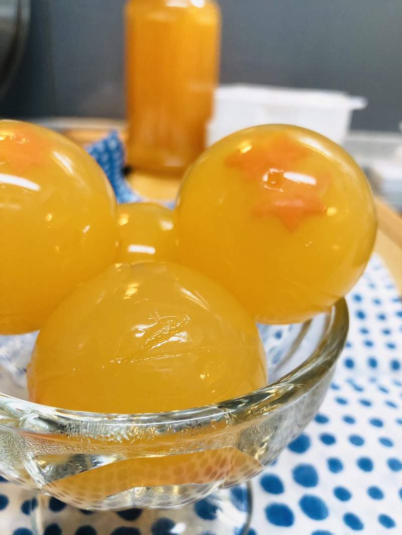 ▼龍珠球高湯的製作方法其實並不難,首先借助星星模型將紅蘿蔔切成小星星形狀,之後將高湯粉倒入水中煮好,再加入吉利丁。最後將紅蘿蔔和高湯倒入球型製冰盒,放入冰箱冷凍成型即可。