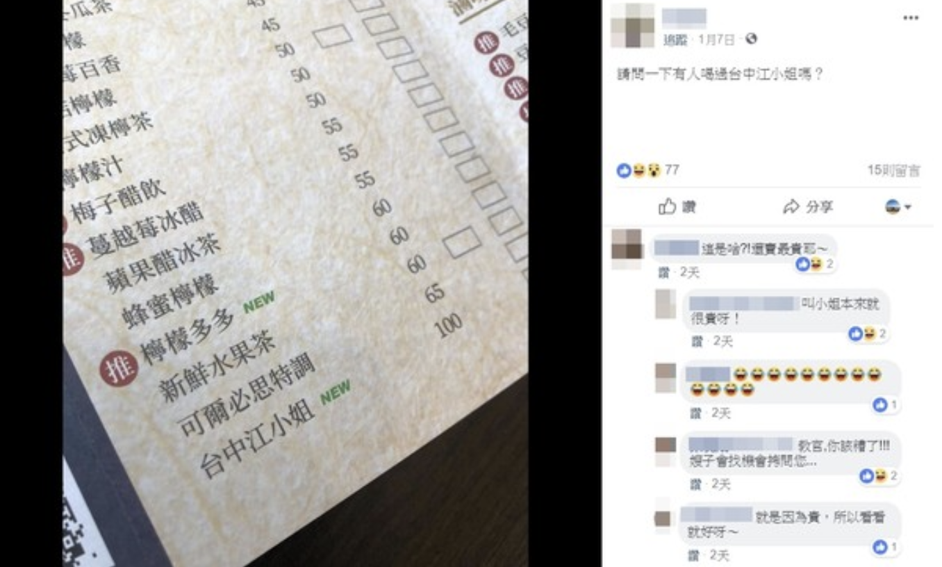 ▼一名網友在臉書分享,表示自己近期光臨一家茶餐廳,對於菜單上一樣品項名稱感到困惑,因而拍照上傳詢問:「請問一下有人喝過台中江小姐嗎?」。