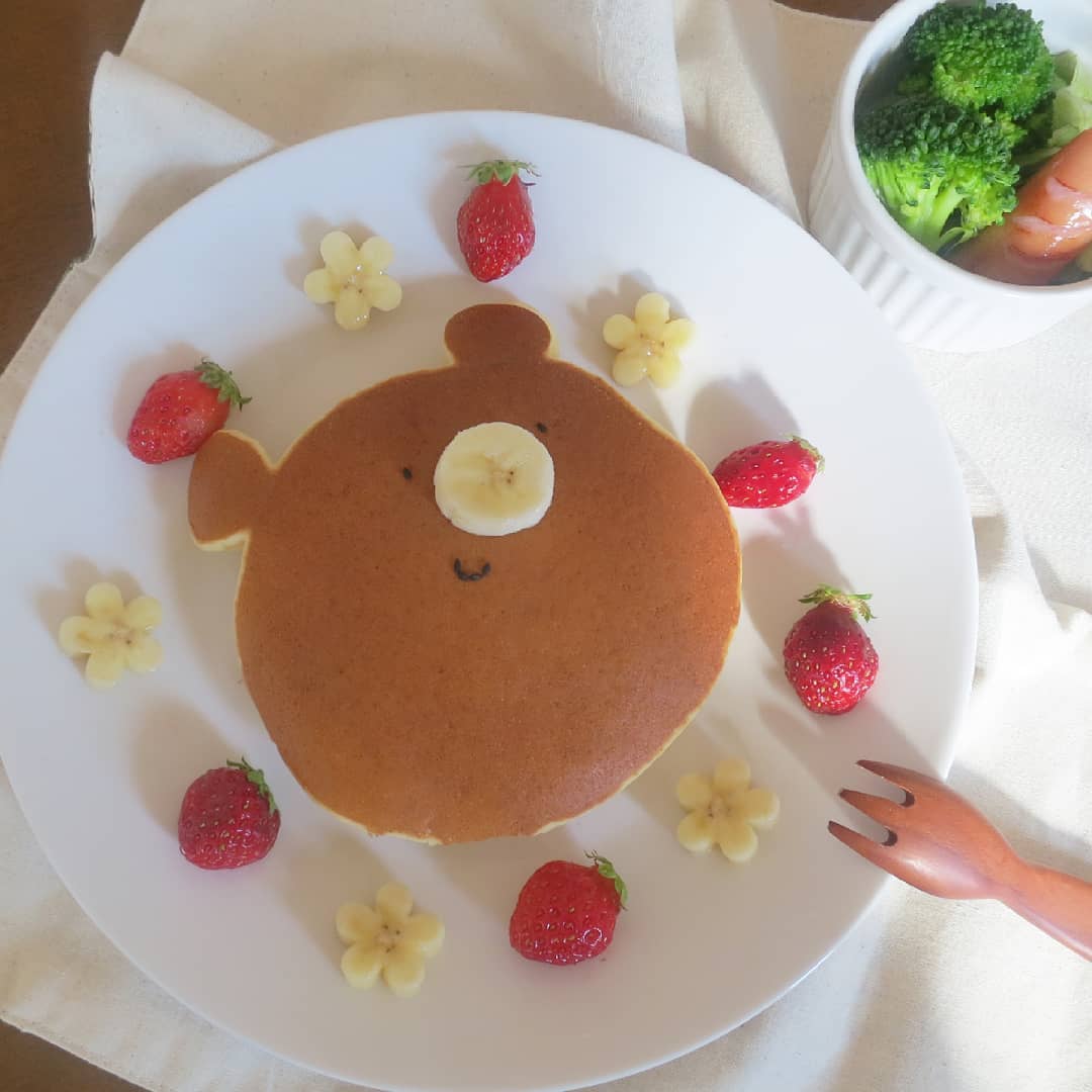 ▼6.花瓣香蕉和草莓圍繞的小熊鬆餅,誰捨得下口啊!