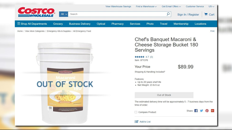 ▼這款桶裝的起司通心粉,重量高達12.25公斤(27磅),可以分成180份!雖然這款食物在好市多的分類上是「緊急用品」中的「緊急食品」,而且也已經推出了幾年,可是卻在最近被美國民眾搶購一空,到處都呈現缺貨的狀況。