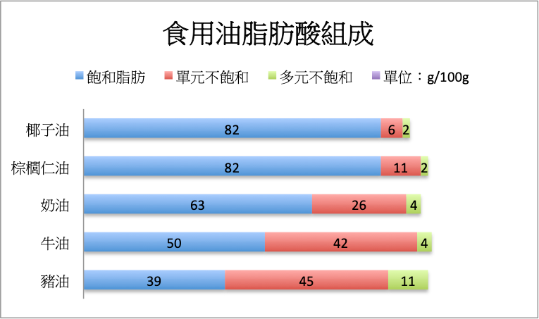 ▼而且豬油飽和脂肪的含量甚至低於奶油、牛肉(油)!大家以為很健康的椰子油跟棕櫚仁油其飽和脂肪含量竟然高達82g,甚至還引起美國心臟協會關注,於2017年報告中特別提醒大家要注意椰子油的使用。