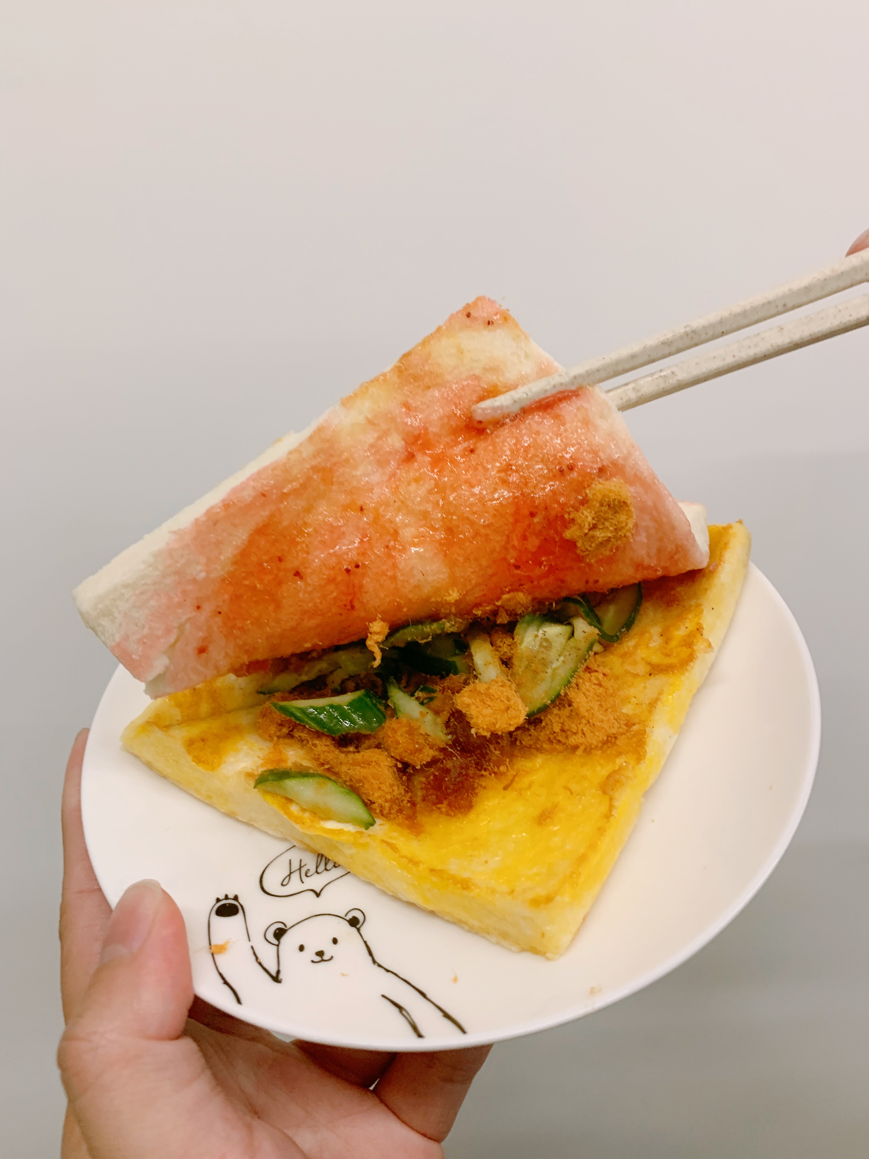 ▼終極BOSS版「法國吐司+草莓醬+肉鬆+小黃瓜+胡椒粉」這個組合小編去早餐店點餐時都有點心虛了…幸好老闆人很好願意幫我做。吃起來出乎意料地驚喜!法國吐司鬆軟搭配草莓醬原本就合理,沒想到加上肉鬆後,鹹甜鹹甜的滋味真的蠻搭的!雖然看起來有點可怕,沒想到卻是最好吃的!!( ♥д♥)