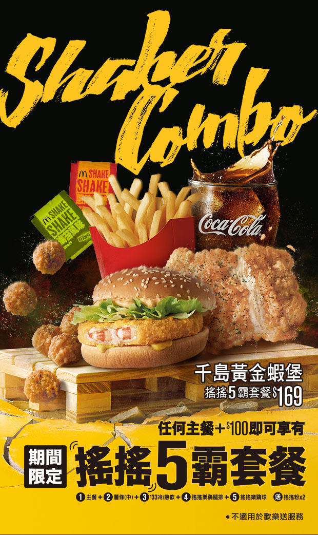 價格:千島黃金蝦堡搖搖5霸套餐169元、大麥克搖搖5霸套餐172元、勁辣雞腿堡172元、黃金起司豬排堡152元。