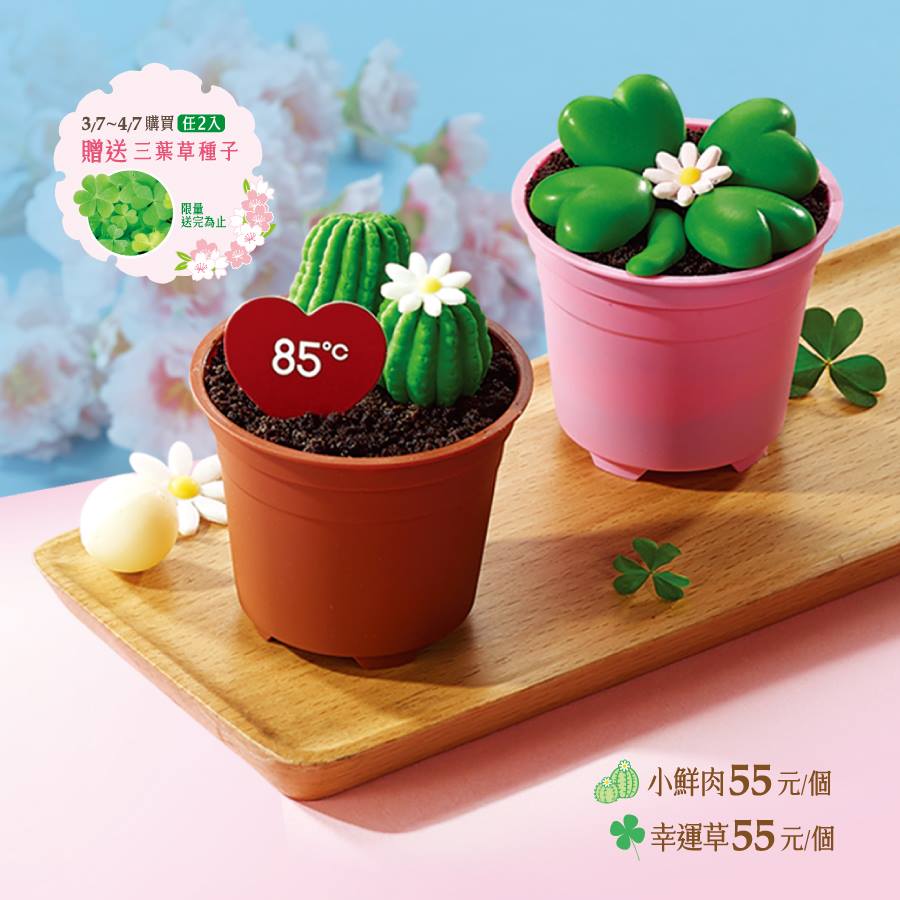 2019年03月09日85˚C的新商品來啦!85˚C前一陣子把便當做成蛋糕,就引起不少話題;這次又把小資族最愛辦公室小物「盆栽」做成蛋糕,分為「小鮮肉(仙人掌)」和「幸運草」兩種,肥肥的葉子超可愛!